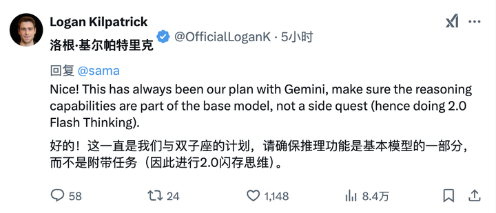「很好!我们一直计划将推理能力作为 Gemini 基础模型的核心部分,而不是将其视为一个附加功能(这也是我们正在推进 2.0 Flash Thinking 能力的原因)」