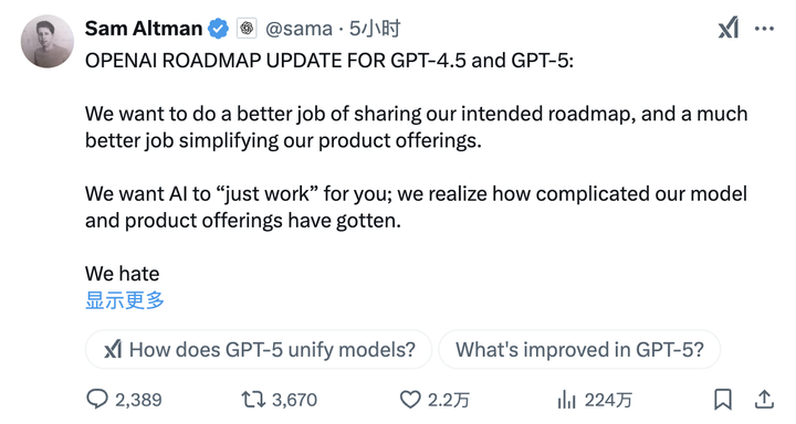 Altman 表示希望更透明地分享公司的发展路线图,同时简化产品体系结构。他强调希望 AI 能做到「开箱即用」,让用户无需费心理解复杂的模型与产品选择。(原来你也知道呀。)