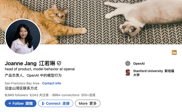 插个冷知识,Joanne Jang 毕业于斯坦福大学,获得计算机科学硕士学位和数学与计算科学学士学位,目前在 OpenAI 担任产品经理,负责模型行为相关工作。