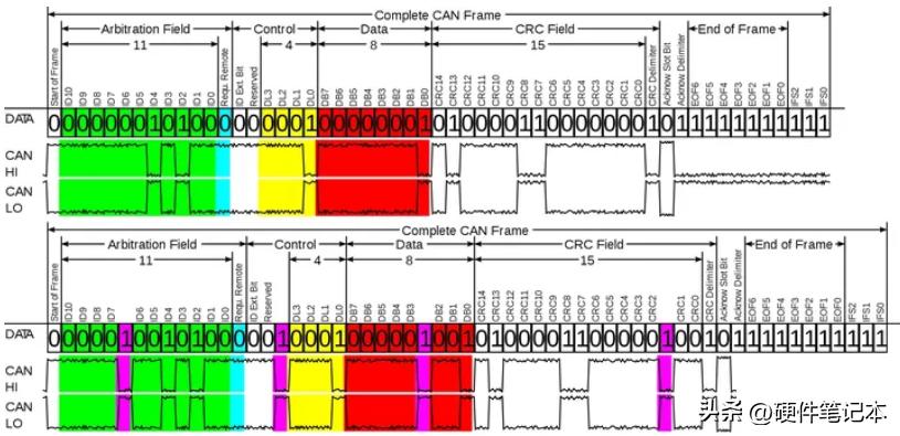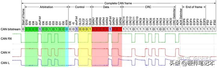 回顾完物理层,咱来看链路层,CAN帧的标准格式。当发送节的MCU将TX由1变0的时候,CAN收发器将CAN-H拉高&CAN-L拉低,接收节点收到了H-L>0.7V的压差后,接收节点的CAN收发器RX输出由1变0。下图是一个节点接收到CAN波形后解码出的RX逻辑。