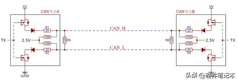 一个典型的双节点CAN网络的物理层等效电路如上图,两颗120Ω终端电阻并联呈现总线电阻60Ω。黑框里是A、B两个节点的CAN收发器(Transceiver),它只负责电平转换。当总线静默时,收发器内部的2.5V电源经15KΩ电阻把CAN-H和CAN-L都拉到2.5V,总线这个状态称之为隐性。当节点A想要驱动总线的时候(TX=0),它同时把内部的上下两个MOS管导通,整个网络的电流流向:节点A的5V电源经二极管、24Ω、两颗终端电阻并联、24Ω、二极管回到节点A的地,总线这个状态称之为显性。CAN总线上的电压实际上就是终端电阻的分压。从节点B来看,CAN-H就变成3.5V,CAN-L变成1.5V,拉出了总线 H - L = 2V 的差分电压,大于0.7V的判断阈值,节点B就认为收到了一个显性(RX=0)。大家可以算一下分压值以增强记忆,后边会用到。