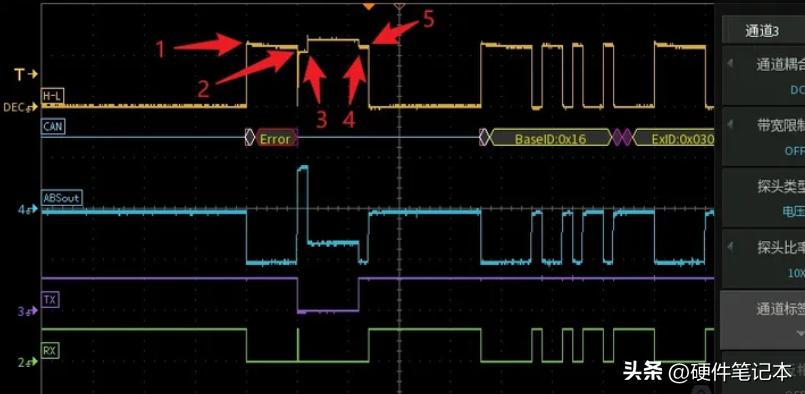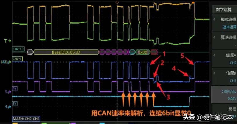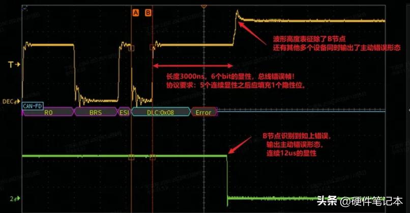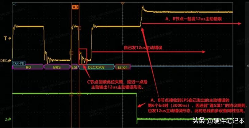 注意看0x00前后的数据段,这一段是CAN-FD的2Mbps速率,节点B因为采样点设置错误读错了BRS这一波特率转换标志,仍按照标准的500kbps去解析节点A的2Mbps速率的数据,对RX信号2us一个采样我用黄色箭头标出来了,可以看到这恰好是6个连续显性0,违反“逢五补一”的规则,故而接收节点B在箭头2~4之间发“主动错误标志”,打断总线通信,告知发送节点你发错了。箭头2~3之间,发送节点A恰好也要发显性,所以节点A此时还没感觉到不对。箭头3之后,节点A想要拉隐性,电压出现一个坑,却发现总线还是显性,此时节点A判断出现了“位错误”,开始输出“主动错误标志”,想告知接收方放弃我这一帧报文。箭头4的位置节点B释放“主动错误标志”,箭头5的位置节点A释放“主动错误标志”。