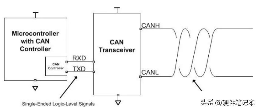 我们先从基础的讲起。CAN节点的电路一般如下图所示,MCU内置了CAN控制器用来将MCU的数据封装为CAN帧格式,同时它也负责CAN帧的校验和错误帧的处理。控制器封装好的逻辑报文经TX RX送到CAN收发器,将逻辑信号转变为真正的总线差分波形。
