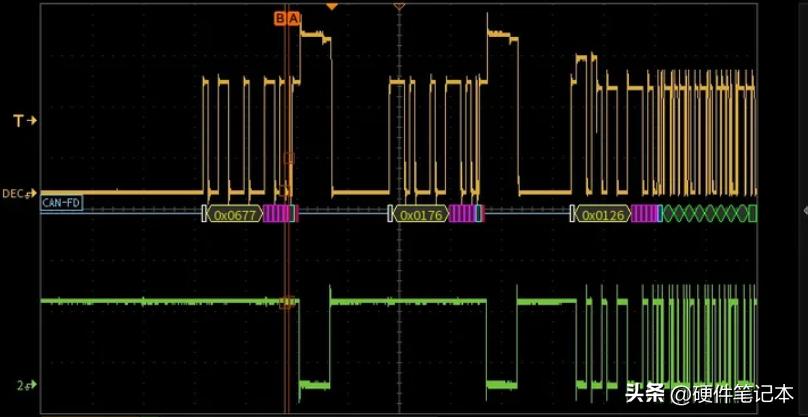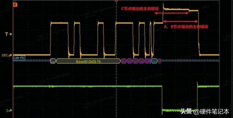 来看一个A B C三节点CAN-FD错误帧的案例,节点C发,节点A、B收:黄色是H-L的差分电压,绿色是节点B的逻辑TX。0x0677和0x0176是两个错误帧。FD区波特率设置为2Mbps。