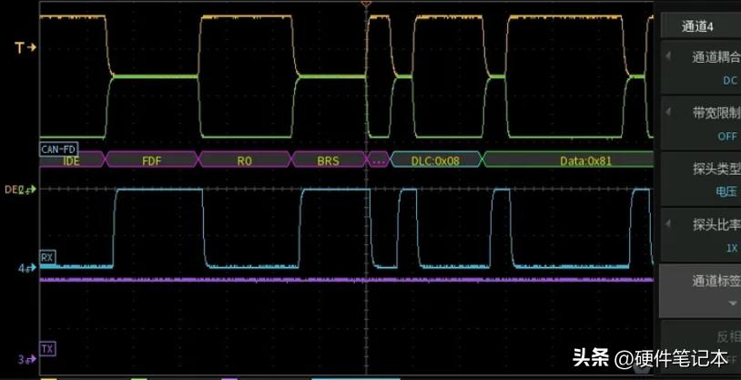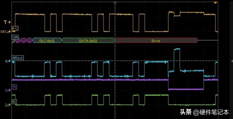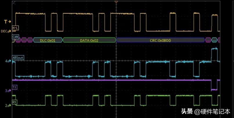 我们将示波器的差分探头和电流探头挂在接收端,下图黄色为H-L的差分电压,蓝色为接收节点的输出电流,RX为收发器将H-L差分电压转换出的逻辑波形,MCU内部的CAN控制器会根据RX的0/1来解读总线。TX为接收节点的发送逻辑,MCU将TX拉低的时候收发器会往总线上驱动显性。