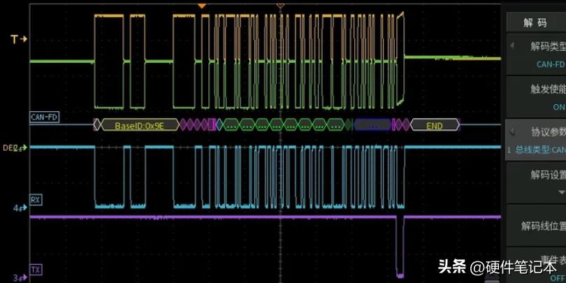 来看一个两节点案例:若节点A发送0x9E报文到总线,从节点B收到的总线波形和逻辑侧波形如下: