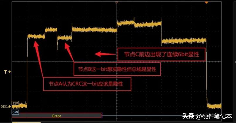 在这时,接收节点收到第6bit显性0的时候,因违背逢五补一的位填充规则,也会往总线上输出“主动错误标志”,所以会在总线上看到连续12bit的显性0,前6个来自发送节点,后6个来自接收节点。