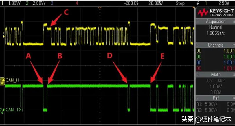 黄色是CAN_H,高电平表示显性0,绿色是我们挂示波器这个节点的逻辑侧TX,低电平表示显性0。箭头A~D是一帧完整的CAN报文,箭头A ~ B这个过程中,我们挂示波器的这个节点和另一个节点正在进行优先级仲裁,根据我们之前讲到的物理层的分压原理,两个节点同时驱动电压会高一截。在箭头C这个bit 该节点想发隐性1但发现总线是显性0,那就说明有另外的节点在发送更高优先级的报文,我们这个节点会主动退出发送,成为接收节点,并在箭头D点校验成功后回应ACK,等待报文结束后这个节点再次参与总线仲裁,成功抢占总线如E点所示。