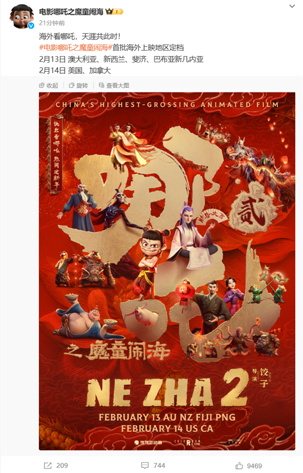 快科技2月13日消息,今日,电影《哪吒之魔童闹海》官宣首批海外上映地区定档。
