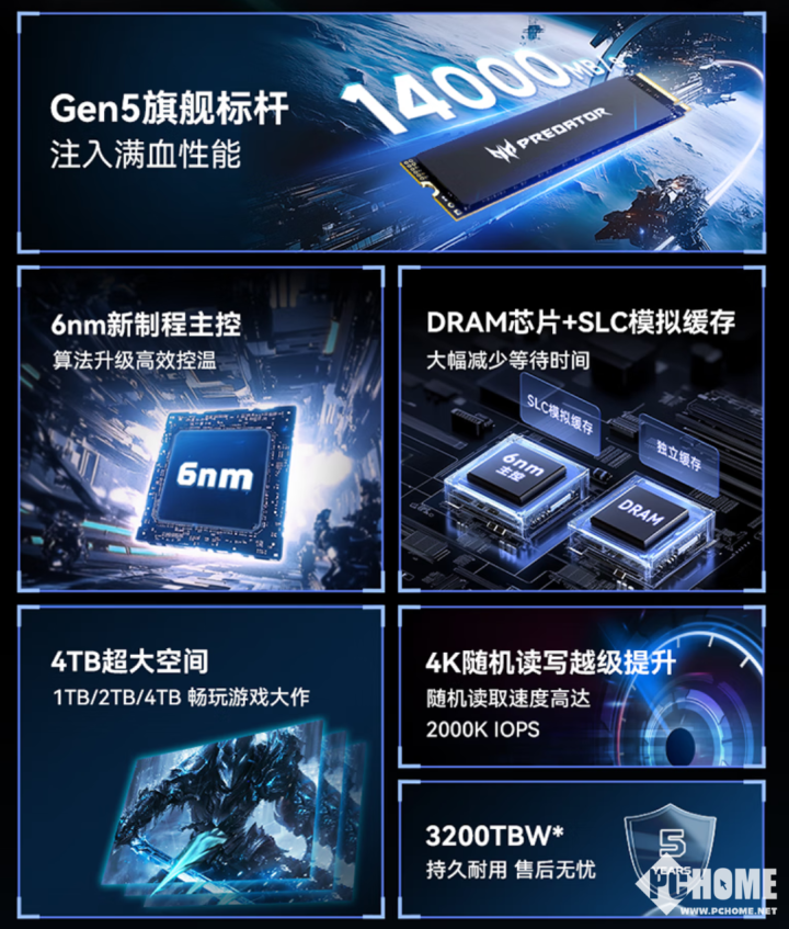 GM9000神舆系列是宏碁全新的PCIe 5.0旗舰级硬盘,搭载了慧荣的SM2508 PCIe 5.0主控,该款主控采用台积电6nm制程工艺打造,功耗大幅优化,效率提升幅度达到70%,并配备独立缓存。硬盘上采用TLC闪存颗粒,单面PCB设计,支持动态SLC缓存技术,官方宣称读取速度可达到14000MB/s,写入速度13000MB/s,接近PCIe 5.0的理论满级速度,也是前代PCIe 4.0 SSD的近两倍。随机读取方面,硬盘的4K读取速度达到2000K IOPS,写入速度则为1600K IOPS,能显著减少日常使用时的等待时间。