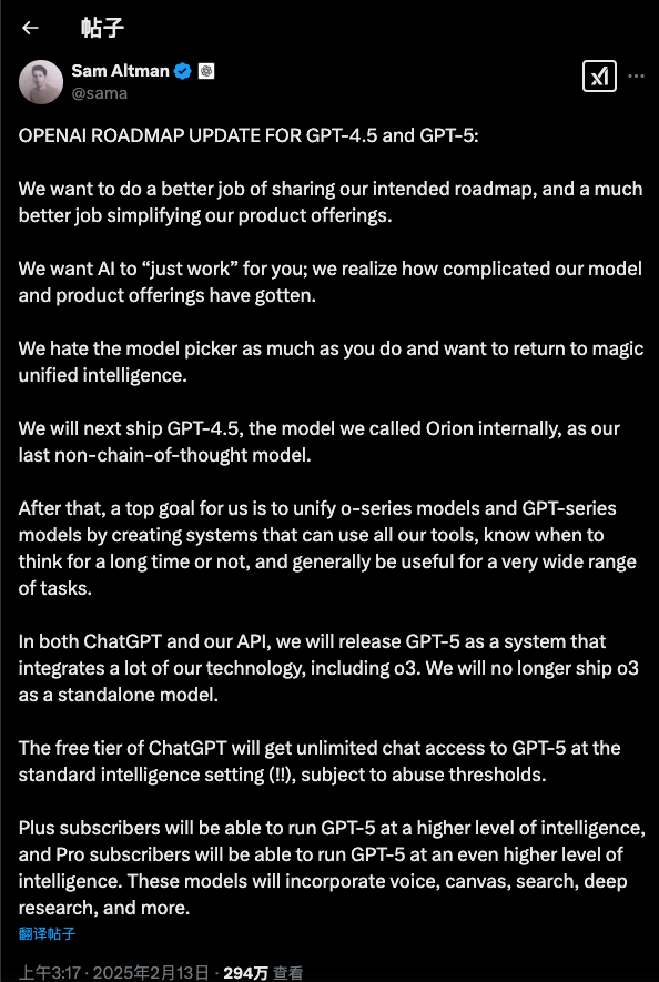 奥特曼表示,OpenAI的新路线图包含GPT-4.5和GPT-5。前者(代号Orion,猎户座)将是OpenAI的最后一款非链式思考模型,计划在数周内发布;后者将是OpenAI未来回归“神奇的统一智能”的首要目标,将在数月内发布。