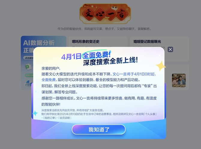 此外,即日起,文心一言上线深度搜索功能;该功能也将于4月1日起免费开放使用。