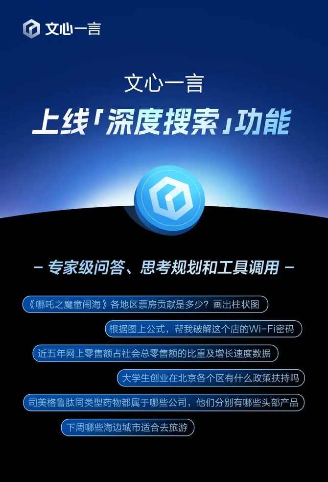 当前,用户可在文心一言官网上体验深度搜索功能,App 端也即将同步上线。