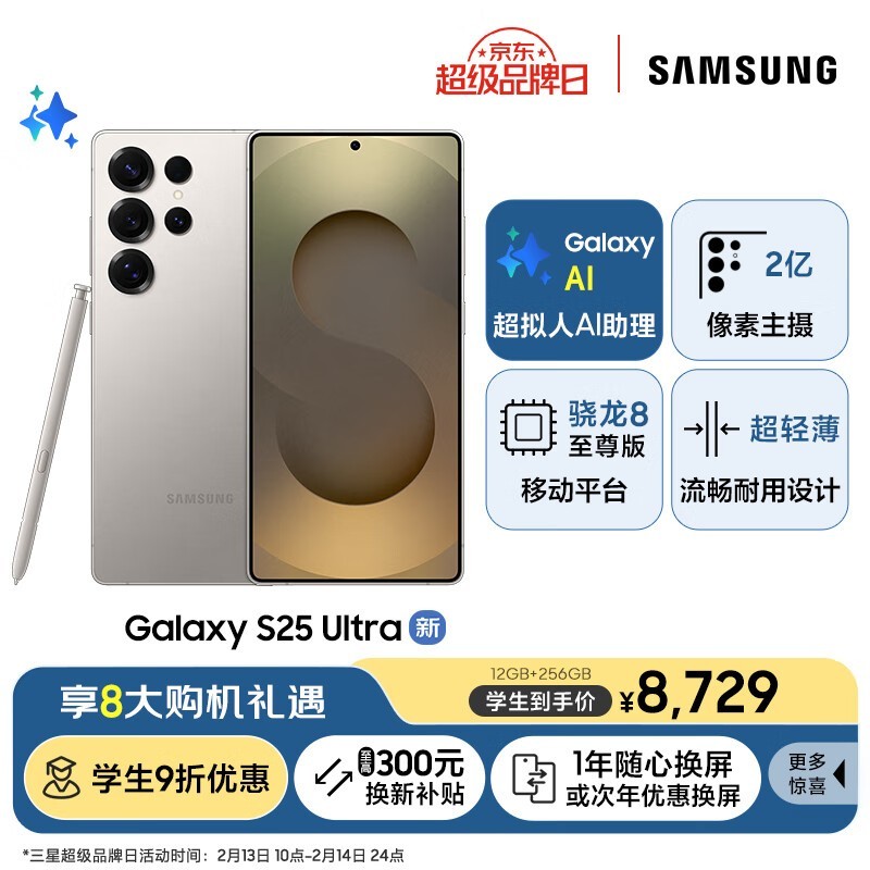 三星 SAMSUNG Galaxy S25 Ultra 12GB+256GB 钛雾灰,8729元入手
