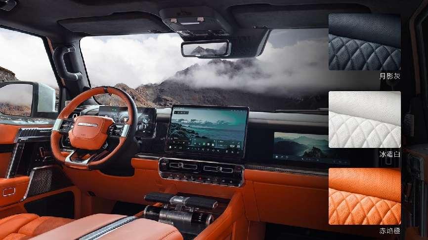 内饰方面,猛士917蛟龙战甲同样追求豪华与科技感的完美结合。车型提供月影灰、冰霜白、赤焰橙三种内饰配色,其中冰霜白、赤焰橙两款车色灵感源自中国龙文化,分别象征冷静勇毅与热情奔放。内饰材质也进行了全面升级,标配Napa真皮座椅、麂皮车顶,同时内饰木纹件还可改装为碳纤维材料,豪华度比肩世界顶级豪车。