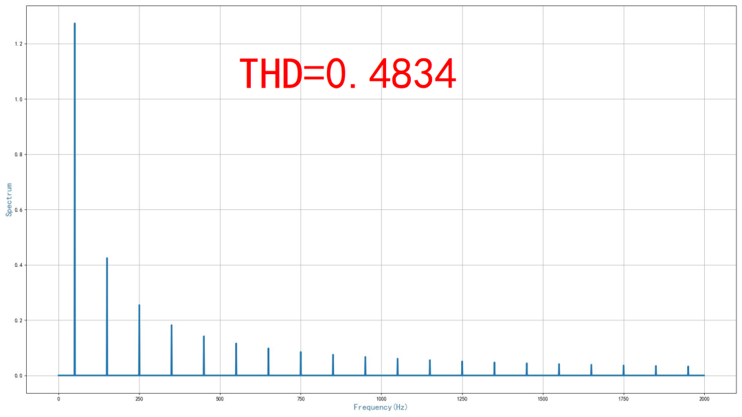 ▲ 2000Hz以内的谐波分量这是一个50Hz,一秒之内的方波数据。采样频率为10kHz。使用FFT计算出它的频谱。通过程序,计算对应的谐波失真。最后,得到谐波失真为0.4834,这与前面理论计算值是一样的。