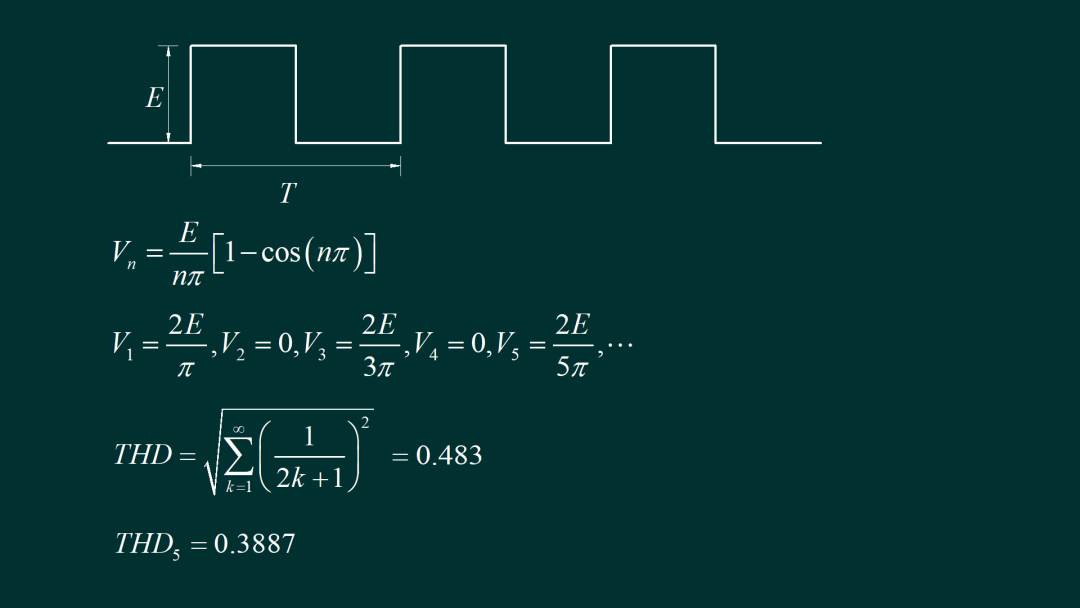 对于一个对称方波信号,根据傅里叶级数分解,可以得到它的谐波幅度。可以看到,它只具有奇次谐波,所以这个信号也被称为奇谐信号。根据谐波失真公式,它对应的总谐波失真约为0.483。如果只计算它的三次谐波和五次谐波失真,则对应失真大约为0.3887。这是理论计算出的谐波失真结果。