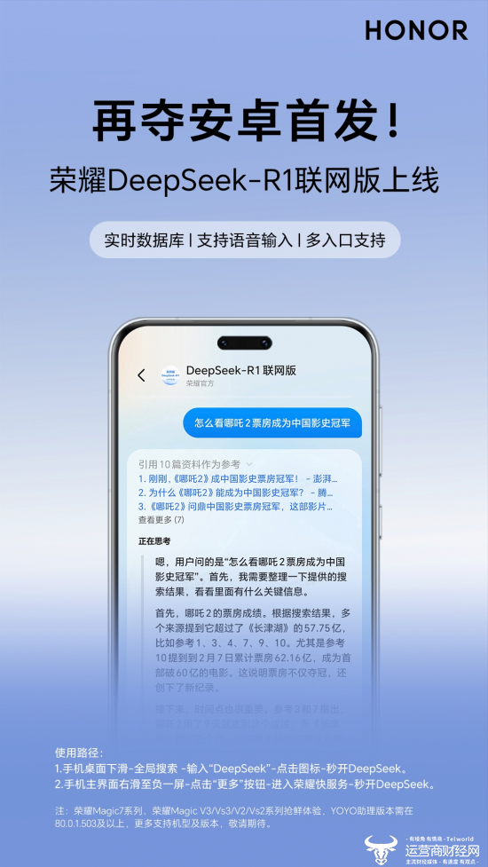 2月13日,荣耀DeepSeek-R1联网版正式上线,首批支持机型包括荣耀Magic7系列及部分折叠屏机型。