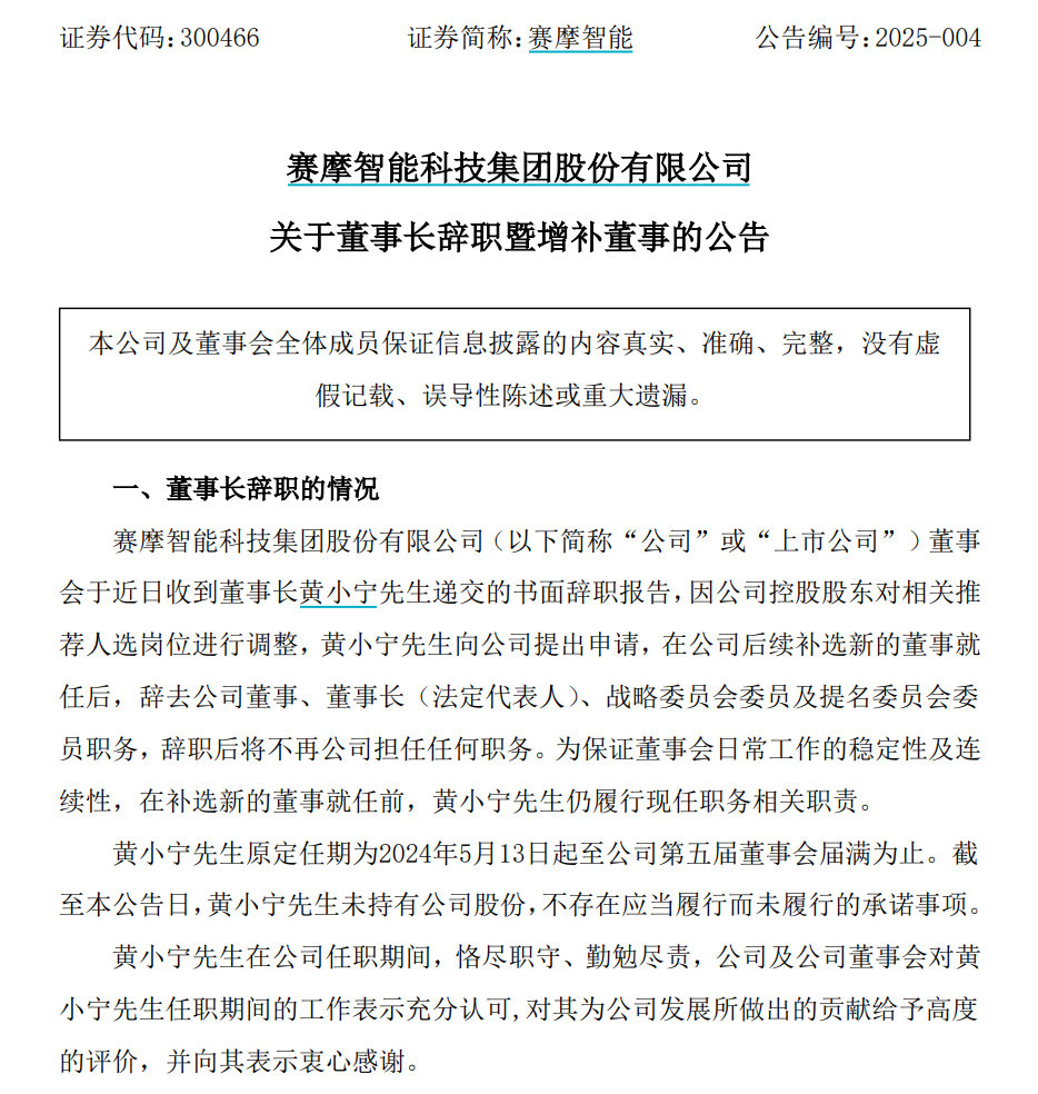 赛摩智能指出,为保证董事会日常工作的稳定性及连续性,在补选新的董事就任前,黄小宁仍履行现任职务相关职责。黄小宁原定任期为2024年5月13日起至公司第五届董事会届满为止。截至本公告日,黄小宁未持有公司股份,不存在应当履行而未履行的承诺事项。