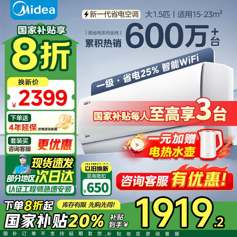 美的KFR-35GW/N8KS1-1新一级能效壁挂式空调1.5匹到手价1719元