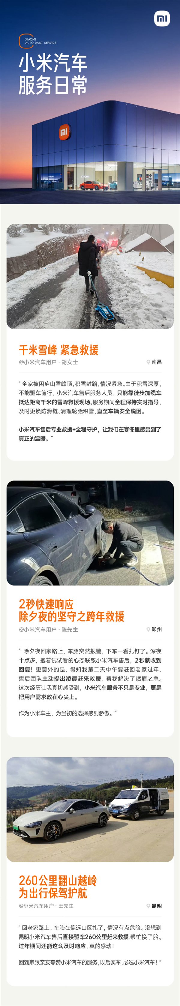 今晚,雷军跟大家分享了几个春节期间的服务小故事。雷军大赞小米汽车服务团队,称他们的专业服务、快速响应和不畏困难深受车主的喜爱。