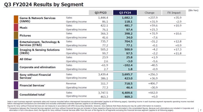(日本,东京)—— 索尼集团公司(下称:索尼)今日公布2024财年第三季度(2024年10月1日——2024年12月31日)业绩数字,如下: