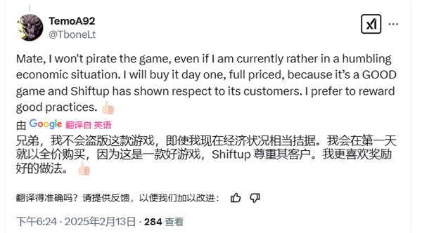 “星弟,我不会玩盗版,虽然我现在手头很紧。我会买首发,全价,因为这是一个好游戏,Shiftup非常尊重玩家。这么好的厂商干嘛不奖励呢?”