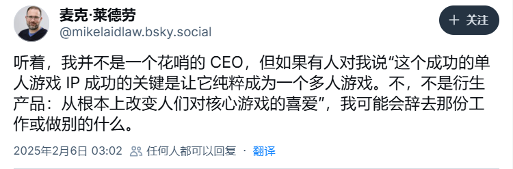 前生软的开发人员,《龙腾世纪》系列前三部的创意总监Mike Laidlaw干脆在社交媒体上直接炮轰老东家。他很不客气地说:“如果有人告诉我,一个单机IP的成功关键,靠的是变成一个纯粹的多人游戏。那我还不如干脆辞职不干了。”
