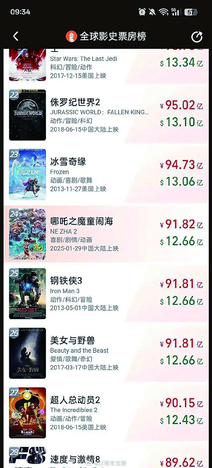 据灯塔专业版全球票房榜显示,截至2月12日,影片《哪吒之魔童闹海》总票房(含预售)突破12.66亿美元,超过《钢铁侠3》《美女与野兽》,进入全球影史票房榜前24名!即将超越《冰雪奇缘》。