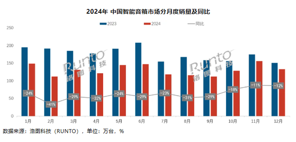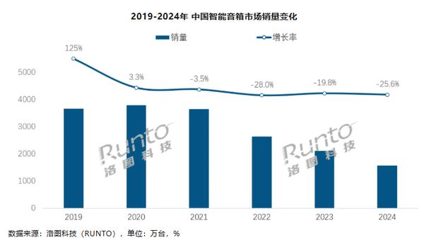 【CNMO科技消息】据洛图科技(RUNTO)最新发布的《中国智能音箱零售市场月度追踪》报告,2024年中国智能音箱市场销量仅为1570万台,同比下降25.6%,销额42.0亿元,同比下降29.4%。这标志着中国智能音箱市场自2021年以来,已连续第四年出现衰退,且当前市场规模已不足2021年的一半。