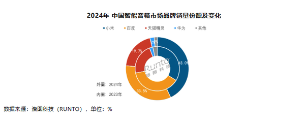 在品牌竞争方面,中国智能音箱市场自2018年以来就形成了百度、小米、天猫精灵三足鼎立的市场格局。2024年,这三个品牌的合计份额更是增长至96.2%,其中小米凭借完善的智能硬件生态系统和强大的品牌力,市场份额达到43.0%,较2023年同期大幅增长9.3个百分点,位居市场销量第一。百度和天猫精灵则因高端带屏智能音箱的回归和低端无屏市场的衰退,导致各自市场份额略有下滑。