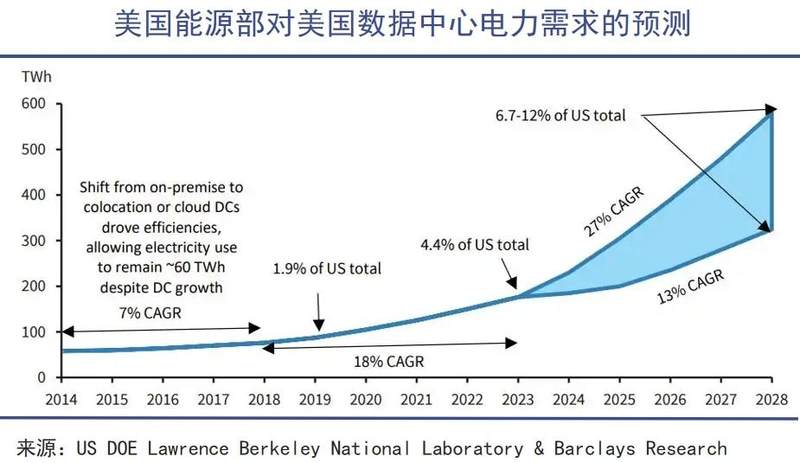 数据中心也是一个庞大的“吞电巨兽”,如亚马逊大型数据中心每年要“吃掉”一个中型城市的用电量。美国能源部的报告显示,该国数据中心用电量从2014年的58 TWh上升至2023年的176 TWh,占国家电力消耗的4.4%。预计到2028年,将激增到325-580 TWh,占美国总用电量的6.7%-12%。
