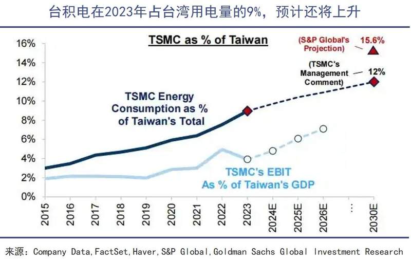 标普预计,到2030年台积电的用电量将占台湾地区的15.6%,乐观情况下,这一家企业就要用掉台湾总用电量的23.7%。一家企业占据一个地区超过20%的电量,放在在人类商业历史上都是非常罕见的情况。