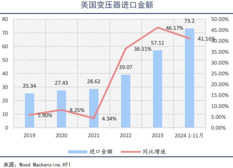 近五年来,美国变压器进口总金额一路上扬。2023年,共从国外购买了约58亿美元,同增 48.7%。2024年前11月,变压器进口金额达到73.2亿美元,同比增长41.16%,创历史新高。