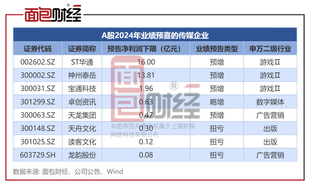 业绩预喜(包括预增、略增、扭亏)的传媒企业合计8家。其中,ST华通、神州泰岳预告净利润下限超过10亿元。