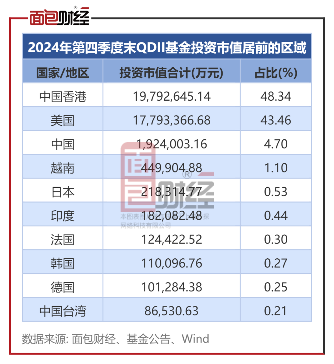 从区域配置来看,根据2024年四季报,港股市场及美股市场仍是QDII基金配置最为热门的区域,投资市值分别为1979.26亿元、1779.34亿元,占QDII基金投资规模的48.34%、43.46%。
