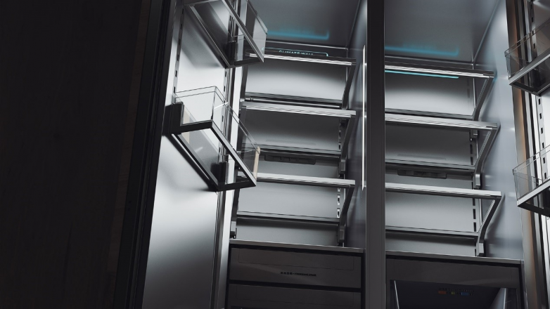 值得一提的是,在冰箱的外观设计上GRF也堪称高定美学的典范。它承袭意式极简主义设计理念,摈弃了复杂的装饰,以流畅的线条和简约的造型,勾勒出优雅大气的整体轮廓。内饰采用意式火山灰色调,灵感来源于意大利西西里岛东岸的埃特纳火山,整体灵动通透,能够更好地呈现食材明艳鲜亮的色彩。内部搁架采用不锈钢、铝、玻璃等多种材质混合制造而成,能让储藏空间看起来更加纯净开阔。而且搁架是可活动的,可以根据食材高度进行重新布局,为食材量身打造适合的储存空间。