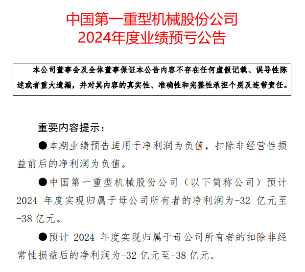 中国一重、中化装备、天宜上佳等10家企业预告2024年净利润上限亏损超过5亿元。