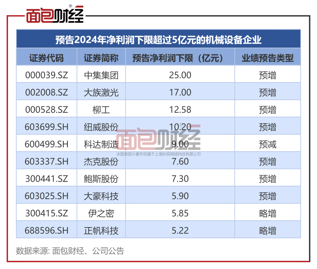 业绩预喜(包括预增、续盈、略增、扭亏)的机械设备企业合计92家。其中,中集集团、大族激光、柳工等10家企业预告净利润下限超过5亿元。