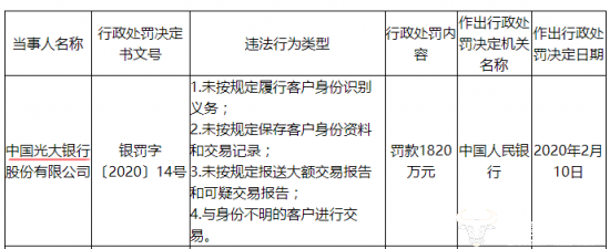 值得一提的是,通过在央行官网内搜索,光大银行在2020年2月也曾收到罚单。当时,光大银行被罚款1820万元,因存在“未按规定履行客户身份识别义务;未按规定保存客户身份资料和交易记录;未按规定报送大额交易报告和可疑交易报告;与身份不明的客户进行交易”四项行为被罚。对比两张罚单发现,光大银行此次被罚依然涉及这四项行为。