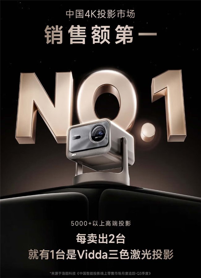 据悉,Vidda为海信旗下年轻科技品牌,同时也是全球首款三色激光投影的开创者。洛图数据显示,2024第二和三季度Vidda在智能投影5000+市场成为销额第一名。