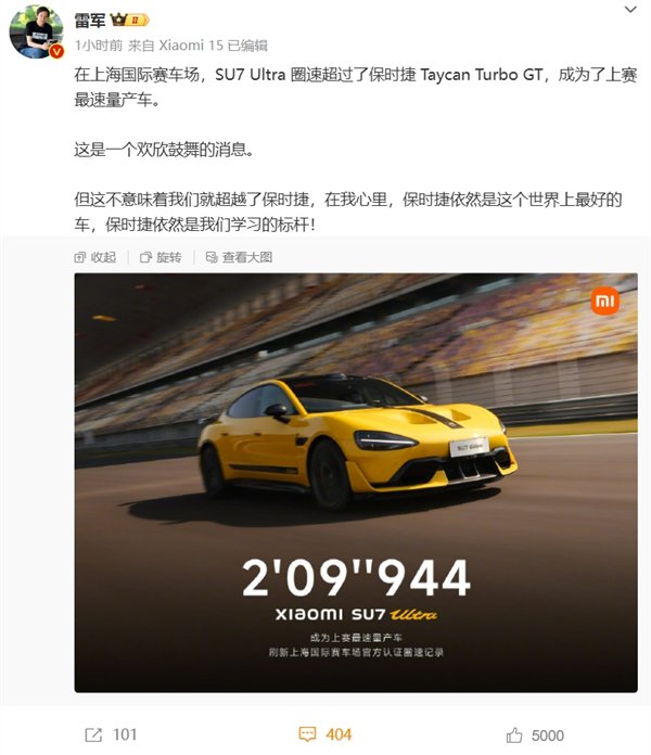“恭喜 @小米汽车 新圈速。此刻,点赞中国制造,也致敬所有心怀梦想的挑战者和探索者。‘生于赛道,驰于公路’是保时捷不变的信条。自356诞生的七十余年来,每次向技术极限的挑战都使我们变得更加强大。让我们在下一个‘赛道’再见! ”