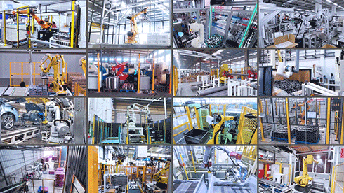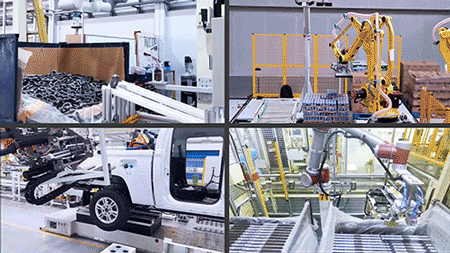 梅卡曼德产品配合机械臂在汽车工厂内上料车内门板,这个场景适合高载重大型机械臂。