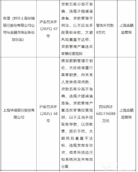 具体来看,上海华瑞银行因”绩效薪酬管理不到位、未经核准履行高管职责、向关系人发放信用贷款、贷款五级分类不准确、违规少提减值准备、贷款管理严重违反审慎经营规则、以不正当手段吸收存款、以贷收费、质价不符、大额风险暴露不达标、违规发放车位贷、信息科技运行和系统开发未有效分离“等12项违法违规行为被罚680万元。