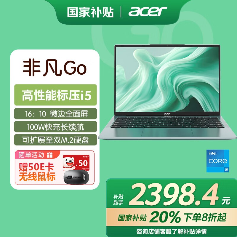 宏碁非凡Go十二代酷睿版轻薄本电脑超值优惠 2398元到手