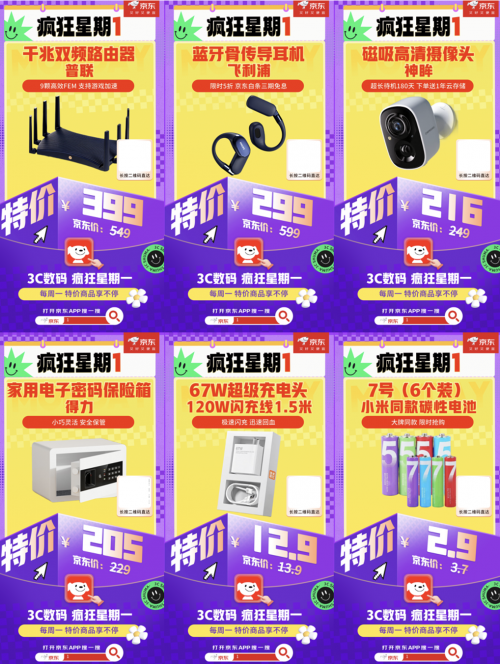 数码产品方面,普联千兆双频路由器BE7200限时直降150元,到手价399元。飞利浦蓝牙骨传导耳机TAT5739限时5折,到手价299元。神眸磁吸高清摄像头限时直降33元,到手价216元。得力家用电子密码保险箱限时9折,到手价205元。京喜自营的67W超级充电头+120W闪充线1.5米套装限时9折,到手价12.9元;同样来自京喜的小米同款碳性电池7号(6个装)限时8折,到手价2.9元。
