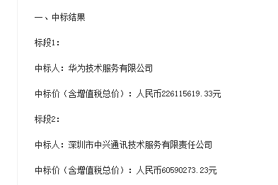 中标结果显示,华为技术服务公司成功拿下标段1,中标价为226115619.33元(含增值税总价);标段2的中标人是中兴通讯技术服务公司,中标价为60590273.23元(含增值税总价)。