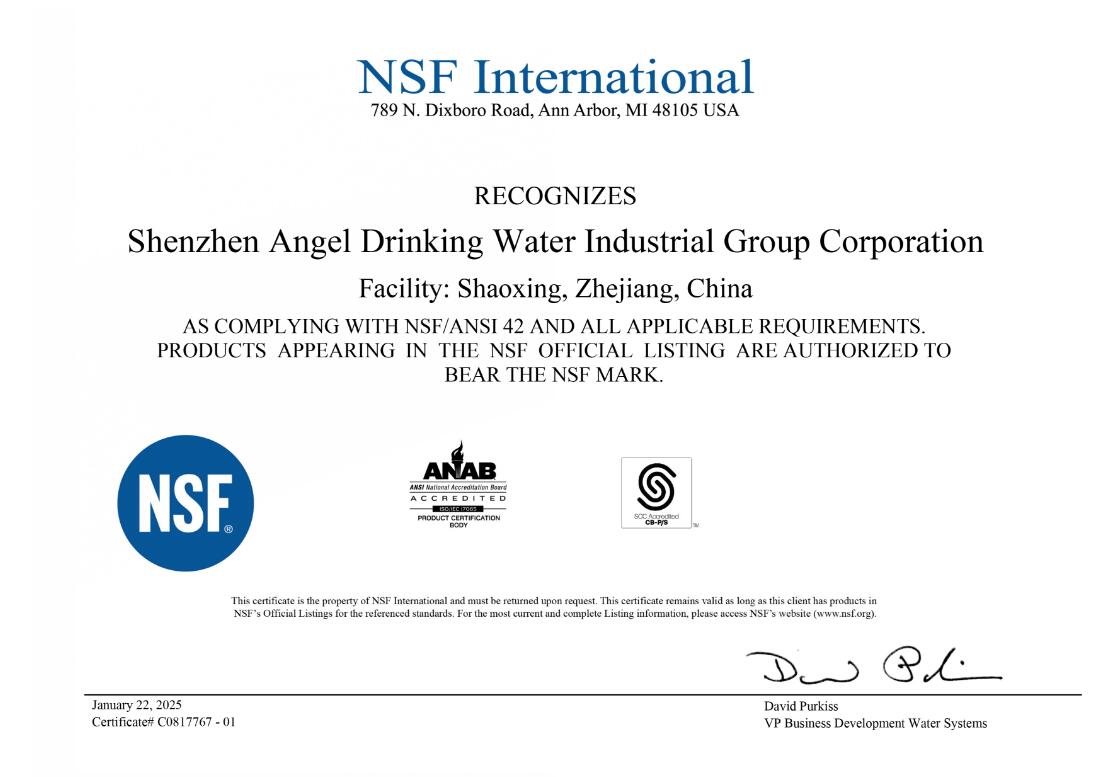 NSF认证是全球饮用水处理装置领域最严格的标准之一,涵盖材料安全、结构完整性、过滤效果、水质改善能力等多个关键检测维度,被全球多个国家和地区的政府及企业广泛认可,也是净水行业最信任的认证。此次J2810系列顺利通过NSF认证,不仅彰显了安吉尔在净水行业的技术创新能力,也意味着该系列产品具备进入全球市场的资质。