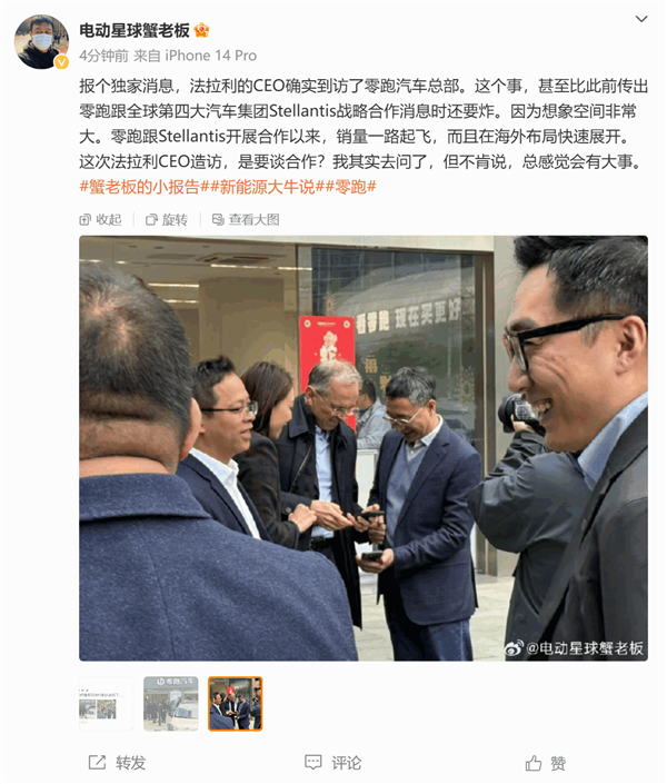 博主透露称,法拉利CEO到访零跑总部这件事,甚至比此前传出零跑跟全球第四大汽车集团Stellantis战略合作消息时还要炸,因为想象空间非常大。