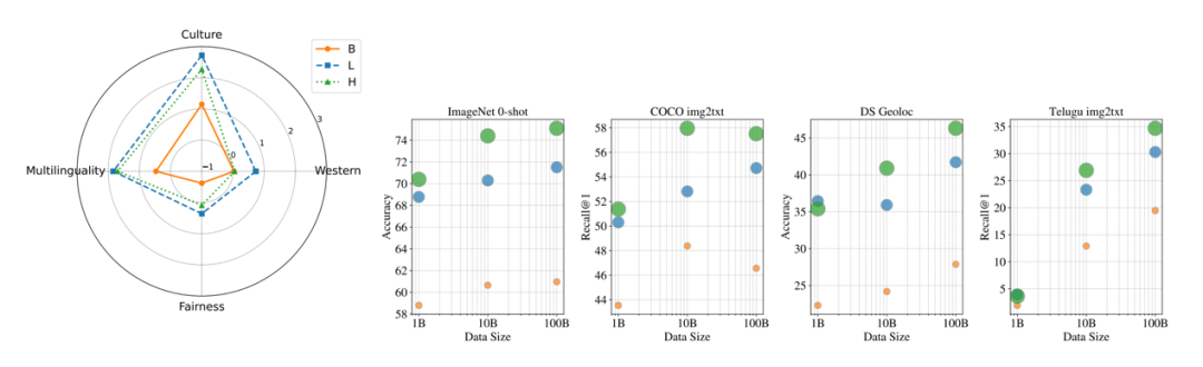 图丨左侧:将数据从 100 亿扩展到 1000 亿样本,比其他指标更显著地增强了文化多样性和多语言能力;右侧:数据规模影响的示例(来源:arXiv)